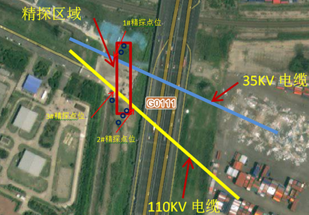 經(jīng)多次探測及數(shù)據(jù)分析成果確認(rèn)35kv電纜1#精探點(diǎn)南側(cè)埋深8.3m;110kv三根電纜東側(cè)2#精探點(diǎn)北側(cè)電纜埋深8.1-8.7米m,西側(cè)3#精探點(diǎn)北側(cè)電纜埋深7.8~8.6m。(埋深測量精度:±5%d+0.1m)