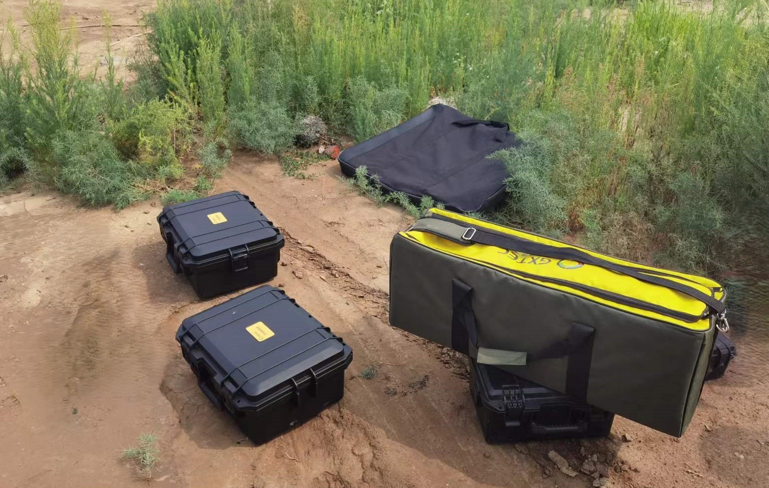 本次檢測使用了嘉信技術新研發(fā)的防腐層檢測儀PDM,我們使用了2臺標配衛(wèi)星同步功能的200W大功率發(fā)射機,一臺接收機和1臺A字架;使用2臺發(fā)射機同步施加信號,可以有效增加待測管道上的信號強度。下圖為PDM接收機、智能A字架和2臺發(fā)射機的圖片。