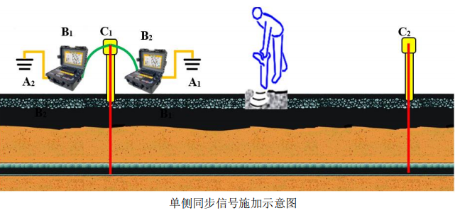 首先在單側測試樁處連接2臺發(fā)射機實現(xiàn)單側信號疊加輸出(如下圖),注意:單側同步信號施加時,發(fā)射機B1、B2信號輸出線與管道和地極的連接線順序必須相同才會產(chǎn)生信號疊加效果,否則兩臺發(fā)射機的輸出電壓相互抵消,大幅度減弱檢測信號。兩臺發(fā)射機不可共用同一地極,并且兩個地極間隔需超過20米。