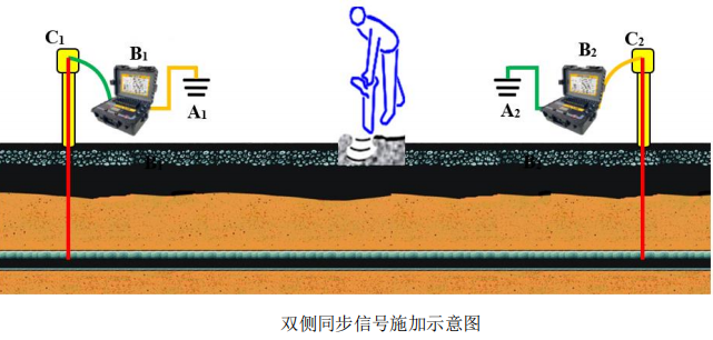 將兩臺發(fā)射機中的一臺發(fā)射機繼續(xù)和測試樁保持連接,將另一臺連接到待測管線的下一個測試樁處,實現(xiàn)雙側同步信號施加(如下圖);注意:雙側同步信號施加時,發(fā)射機 B1、B2 信號輸出線與管道和地極的連接線順序必須相反才會產(chǎn)生信號疊加效果,否則兩臺發(fā)射機的輸出電壓相互抵消,大幅度減弱檢測信號。